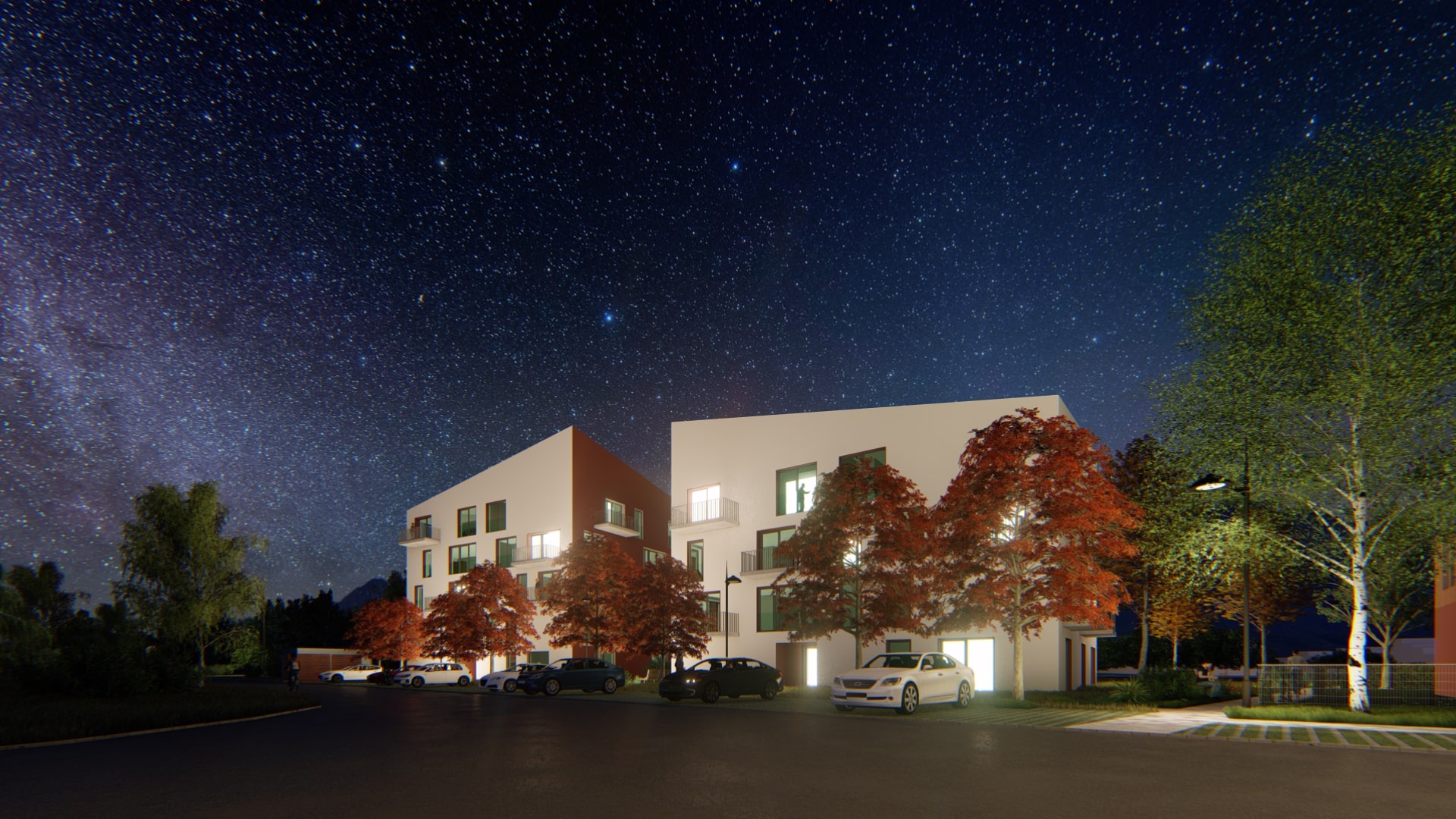 Okolie bytových domov bude upravené parkami so zeleňou, detskými ihriskami, chodníkmi a lavičkami.