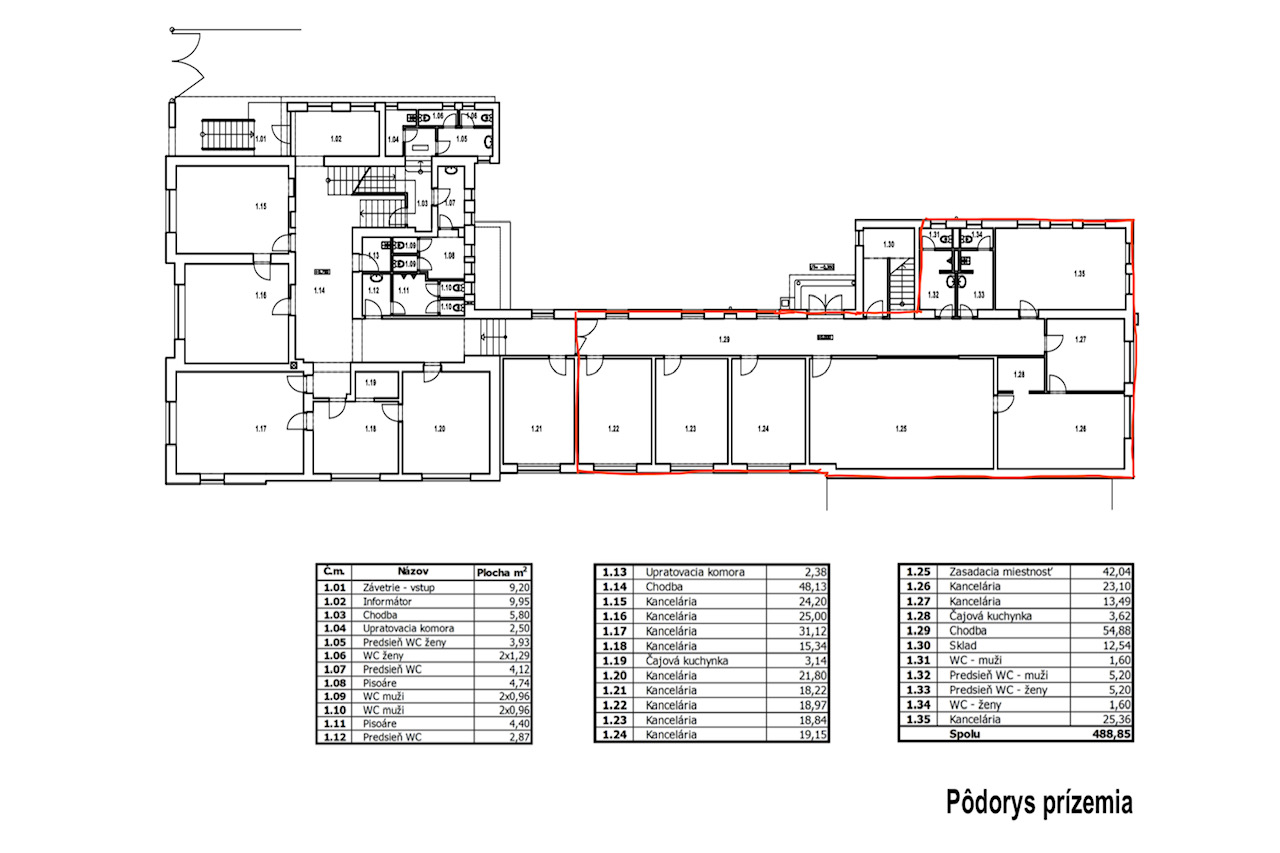 Na spodnom podlaží sa nachádza 6 kancelárií rôznej veľkosti plus zasadačkakuchynka a social. zariadeniaPriestor je s možnosťou úprav po dohode s majiteľom. Všetky miestnosti sú vybavené internetovým pripojením.