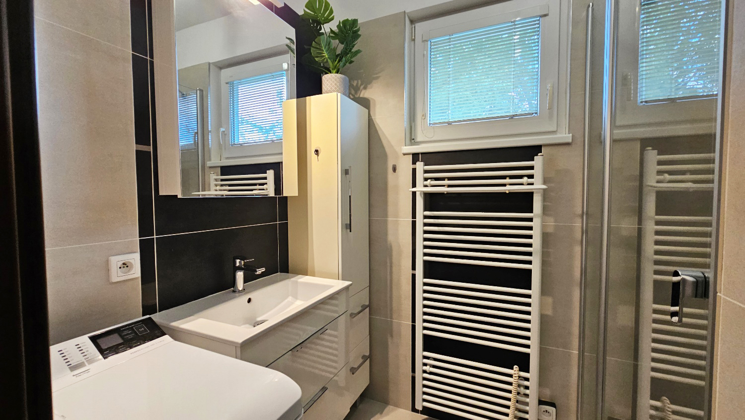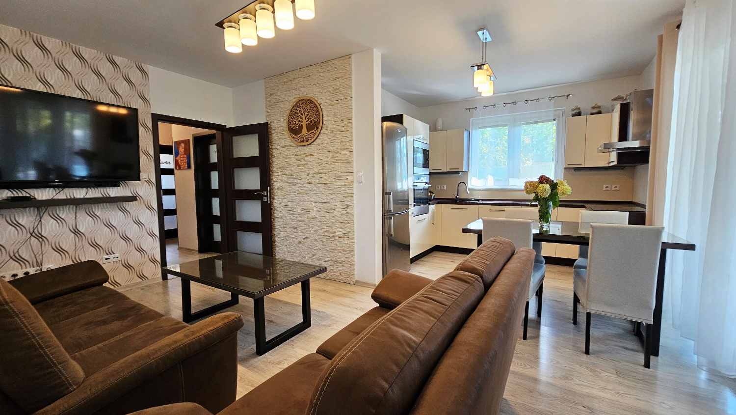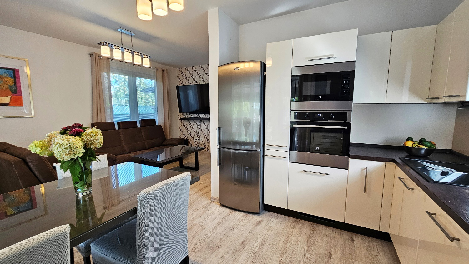 Dom z roku 2015 s betónovými základmi, zvislé nosné konštrukcie montované z prefabrikovaných dielcov na báze dreva. Elektrické podlahové kúrenie s termostatmi v každej miestnosti, plastové okná so žalúziami a sieťkami proti hmyzu. Podlaha laminátová alebo dlažba. Moderné zariadenie, kuchyňa Electrolux + Whirlpool, automatická práčka Electrolux, veľkoplošný televízor LG.