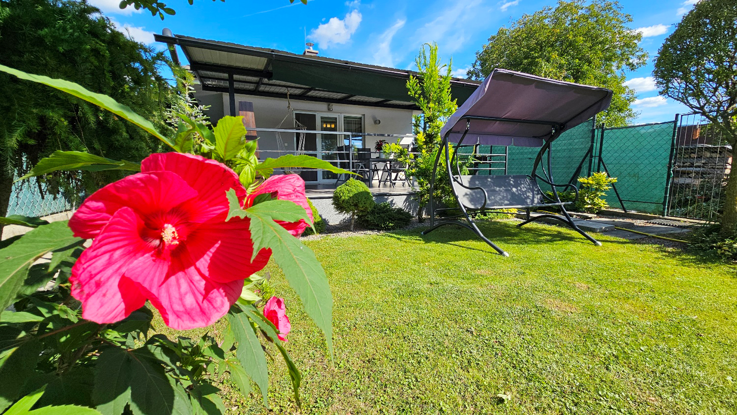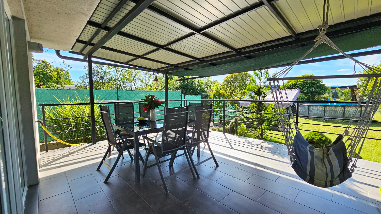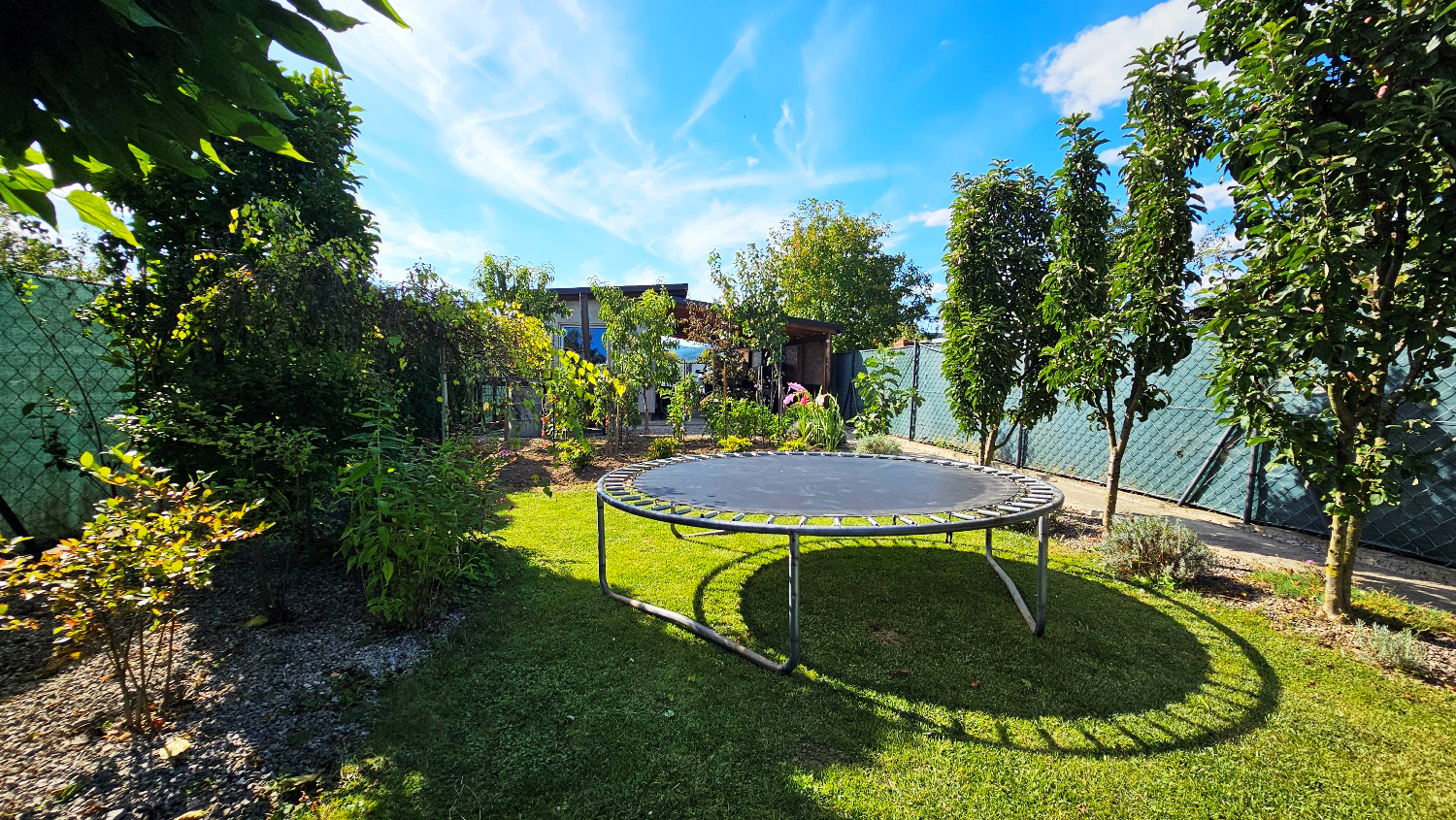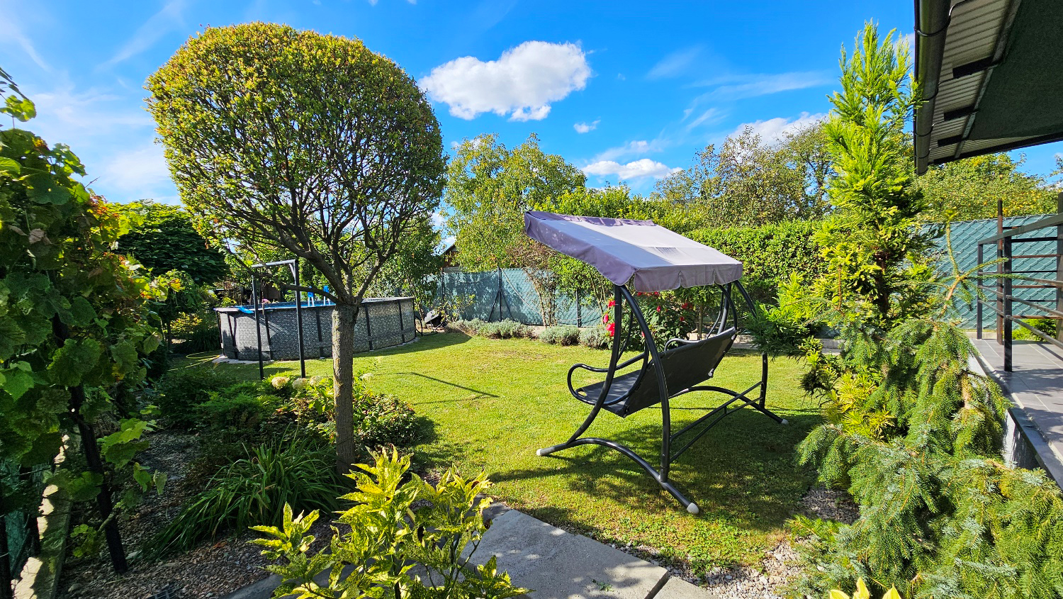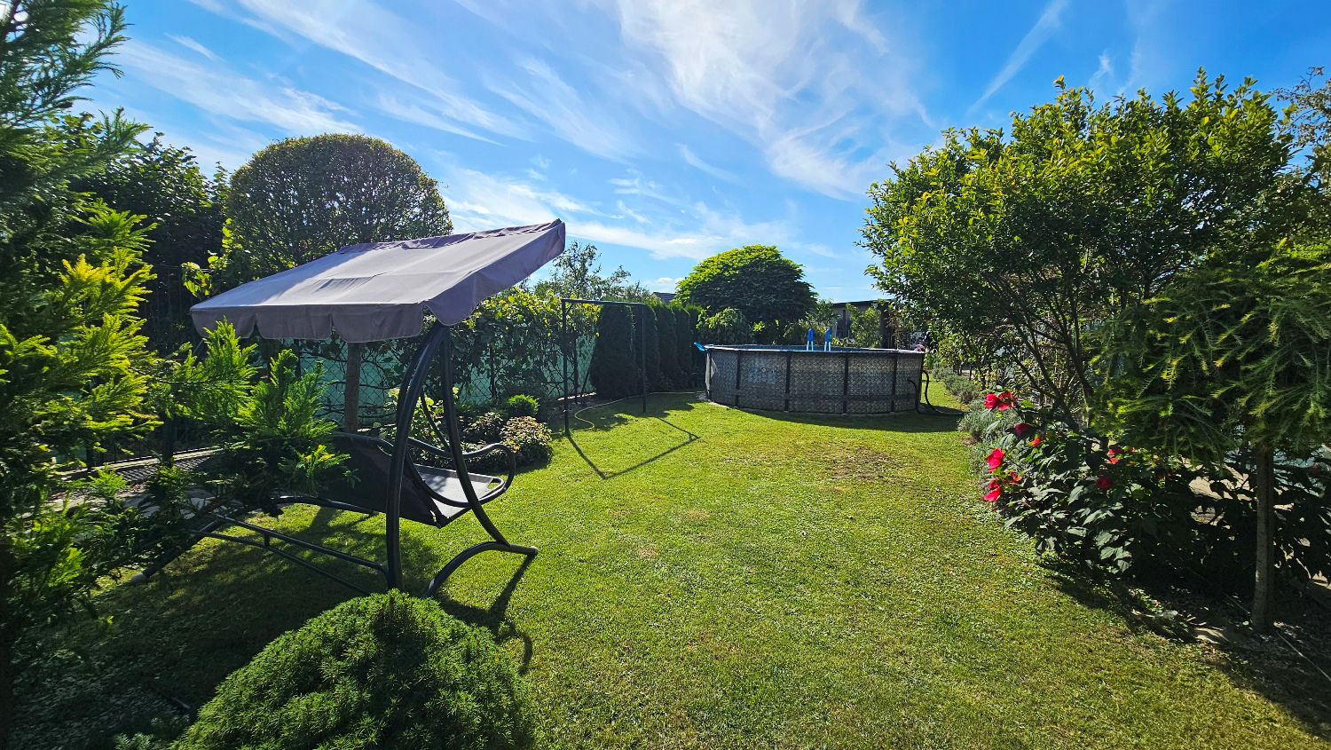 Nadzemný bazén, trampolína, relaxačné zákutia v tieni stromov, zdravé okrasné rastliny pre obdivuhodný vzhľad záhrady. Hospodárska budova s letnou kuchyňou a podpivničeným skladom. Nadštandardný počet parkovacích miest na vlastnom pozemku.