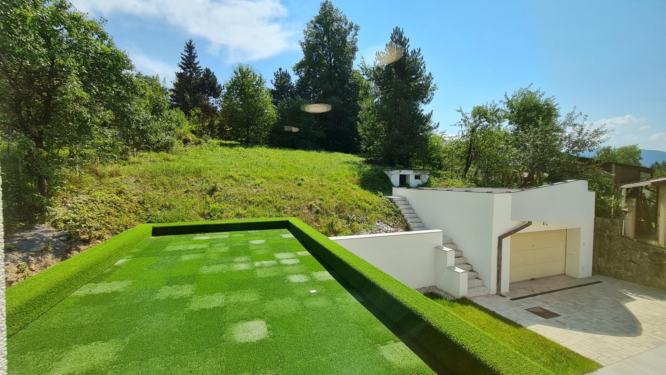 • Prvé poschodie (97,4 m²): 5 samostatných miestností, spoločné WC, spoločná terasa orientovaná do ulice a jedna miestnosť s vlastnou terasou do záhrady
