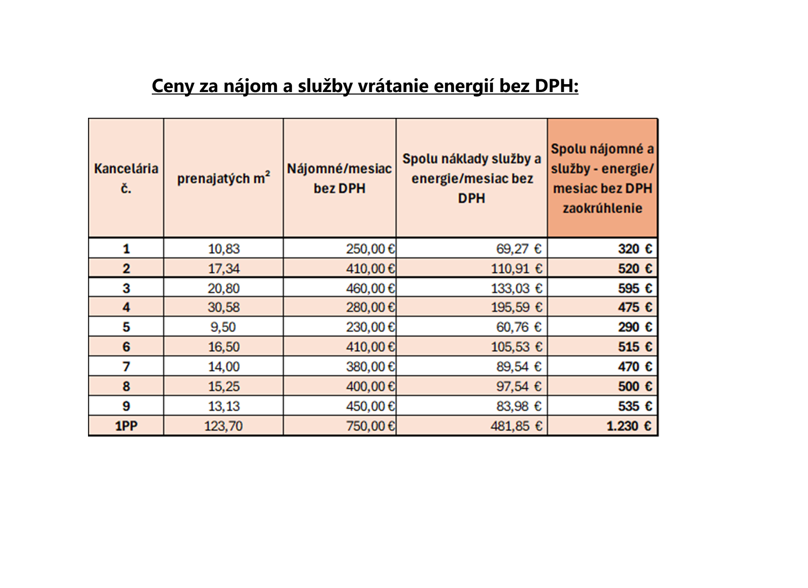 Ceny jednotlivých priestorov nájdete obrázkoch pôdorysu. Viac informácií Vám radi poskytneme telefonicky na Call centrum tel.: 0910 86 11 86. Nájdete na stránke realitymgm.sk pod ID 16108.