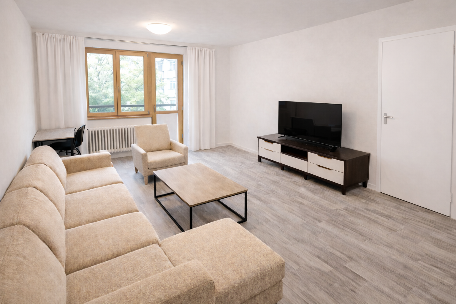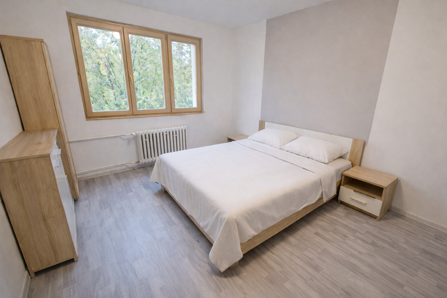 Dispozícia bytu je prakticky riešená. Nachádza sa tu priestranná obývacia izba so sedačkou a výstupom na balkón, ktorý poskytuje príjemný výhľad do zelene. Samostatná spálňa ponúka dostatok priestoru na oddych a súkromie. Súčasťou bytu je aj samostatná kuchyňa vybavená kuchynskou linkou a jedálenským stolom. Kúpeľňa je vybavená vaňou a práčkou, samostatná toaleta a byt dopĺňa vstupná chodba s úložným priestorom. Veľké okná zabezpečujú dostatok prirodzeného svetla počas celého dňa, čo vytvára príjemnú a vzdušnú atmosféru bývania.