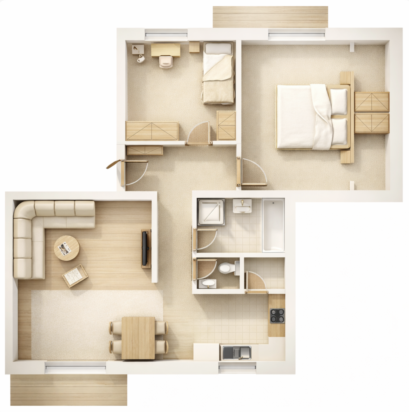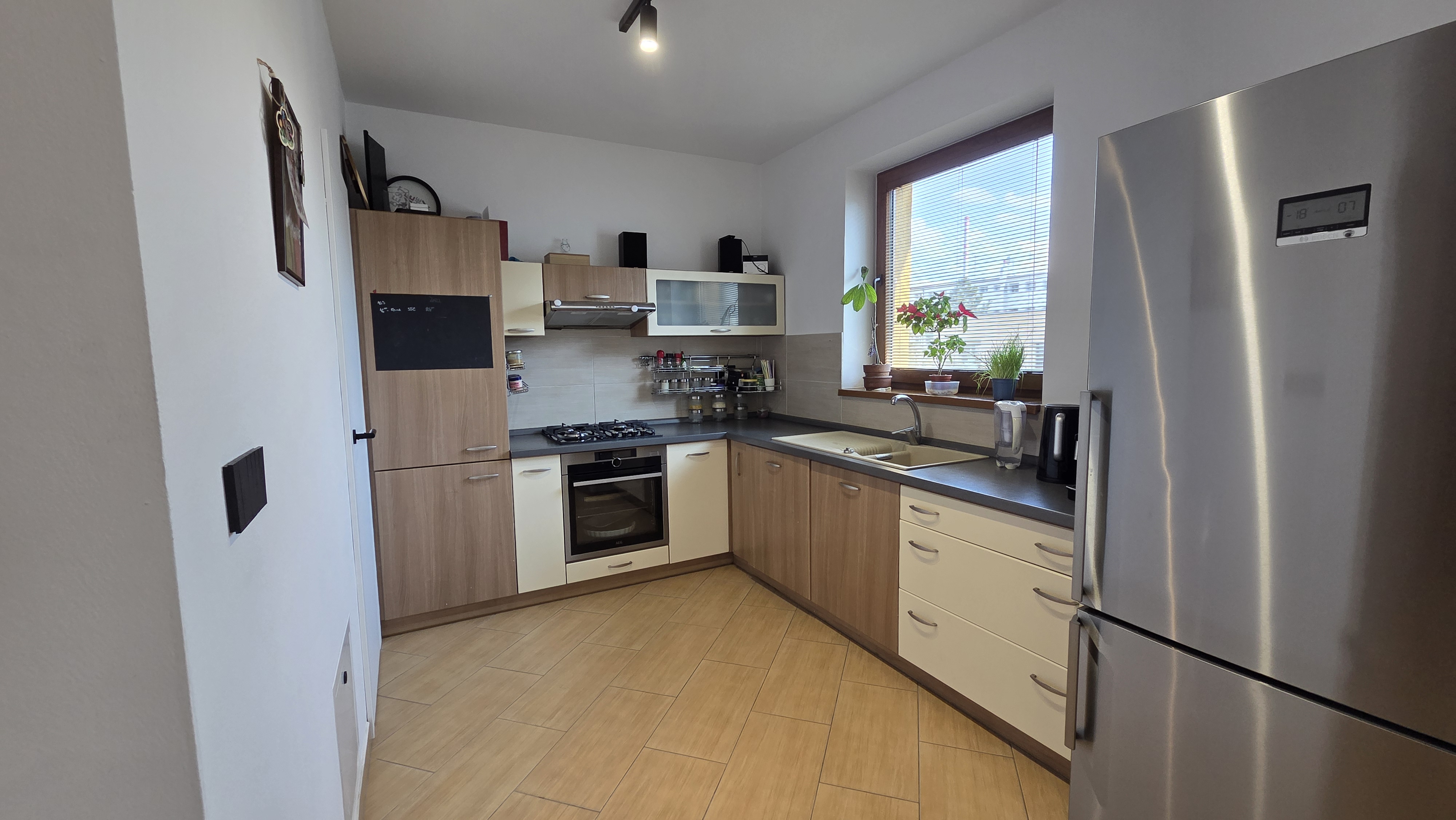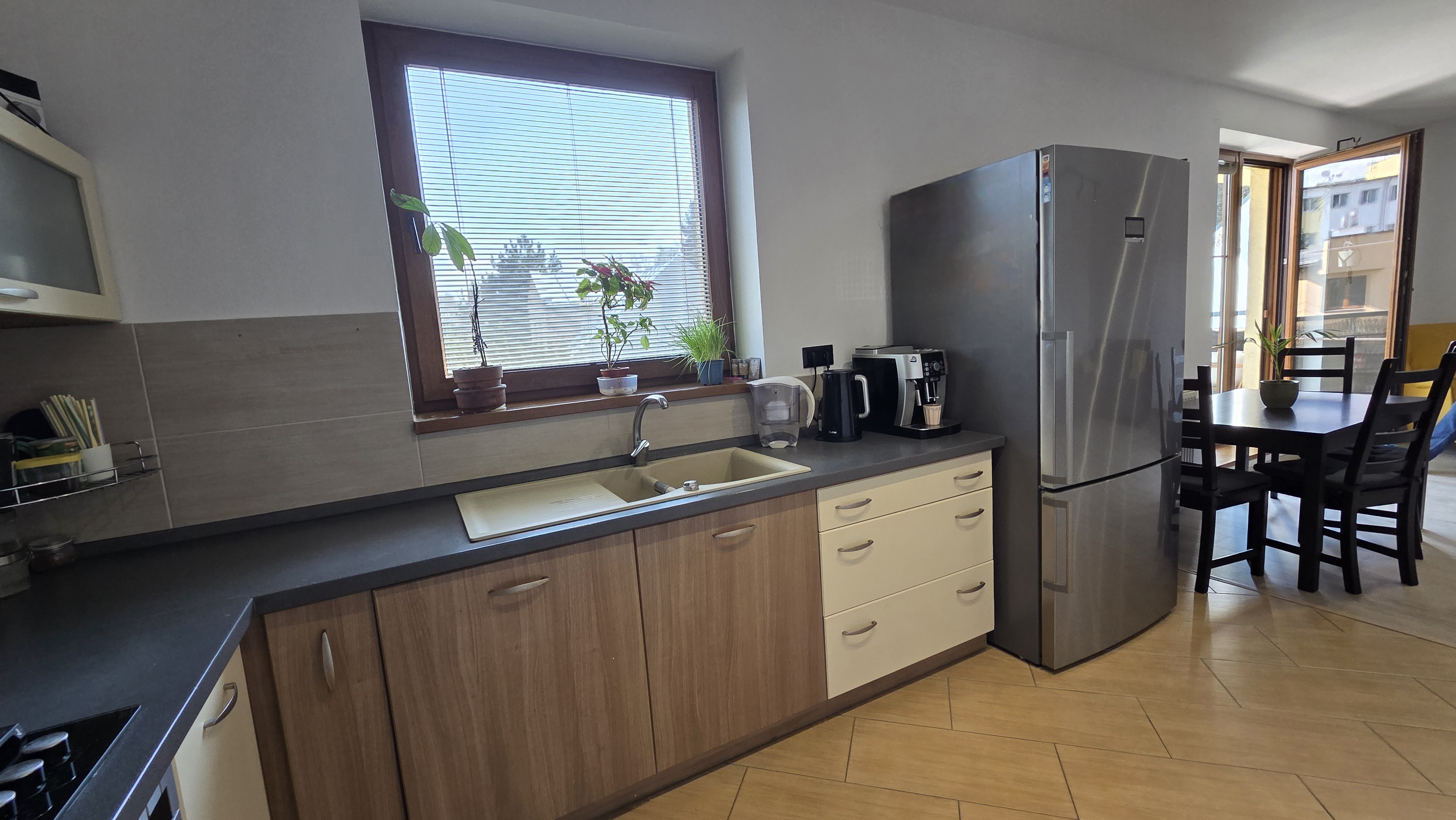 Dispozične byt ponúka prakticky riešený priestor pre rodinný život – dennú časť s obývačkou prepojenou s kuchyňou a jedálňou, dve samostatné izby a dostatok úložného priestoru.