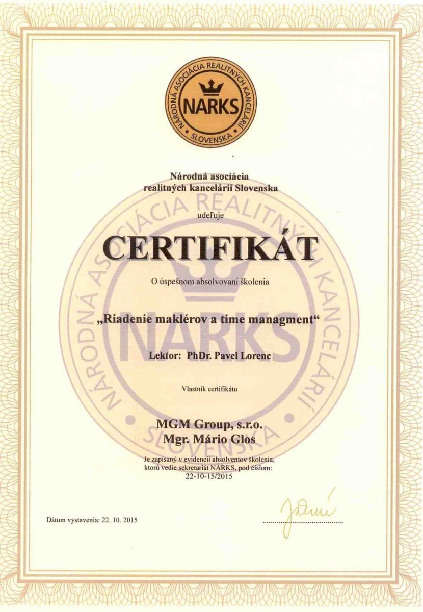 Certifikát - Ako získať kvalitného makléra Certifikát - Riadenie maklérov a time managment