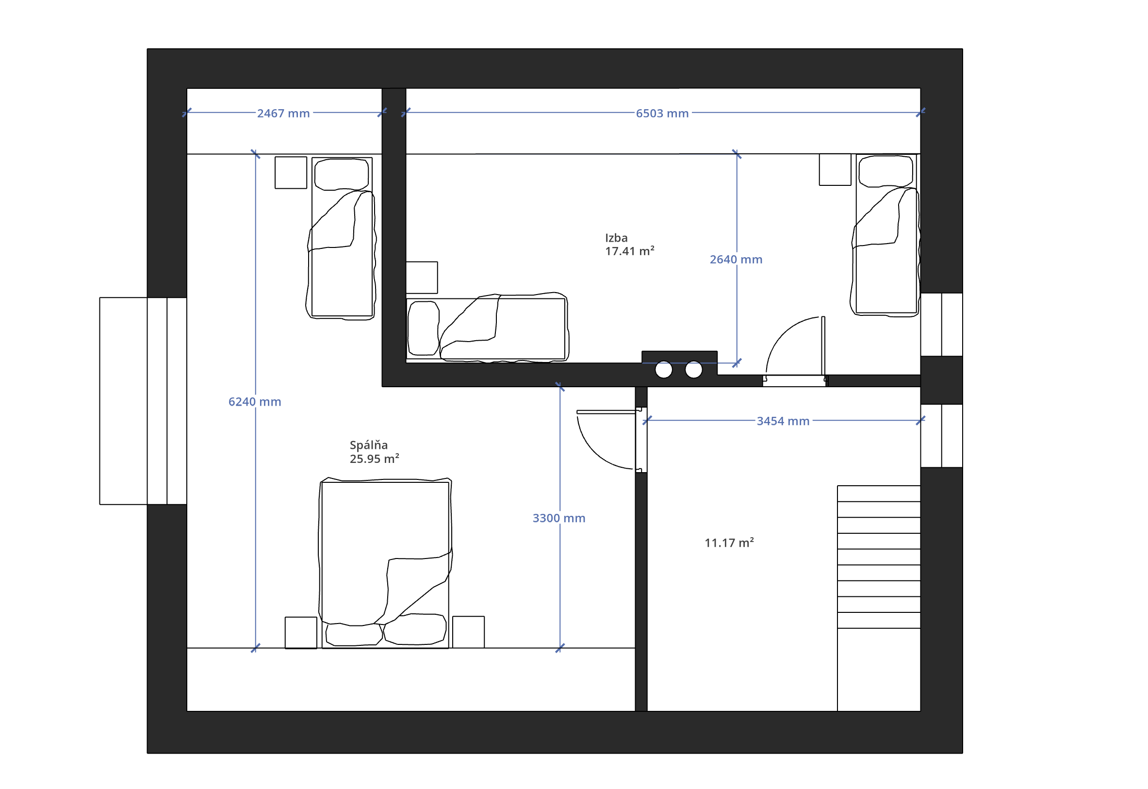 • Podkrovie (55 m²): dve samostatné izby a priestor pre druhú kúpeľňu