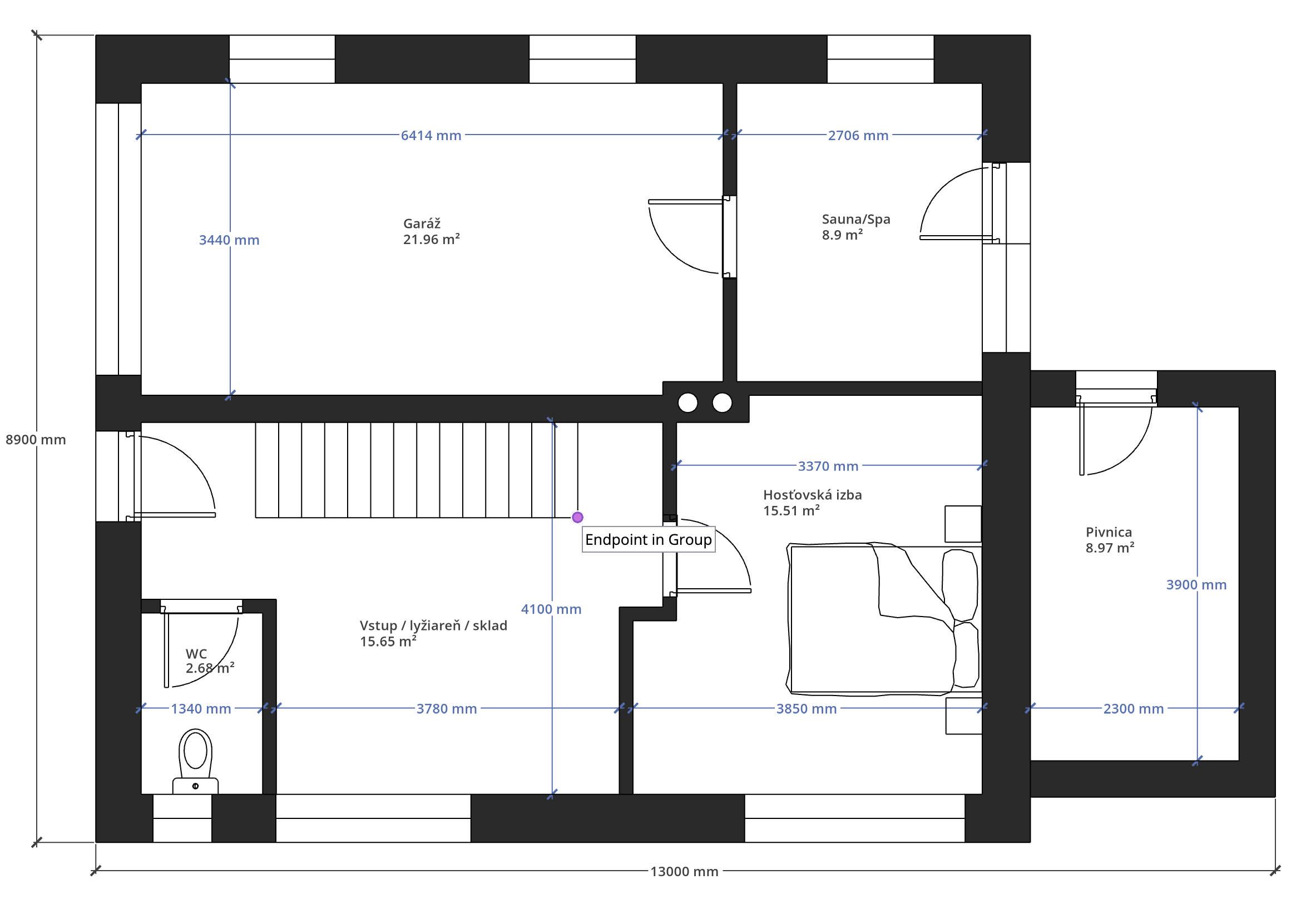 • Prízemie (73 m²): garáž, vstupná hala, lyžiareň, technická miestnosť, samostatné WC, hosťovská izba alebo apartmán, miestnosť predpripravená pre wellness so saunou