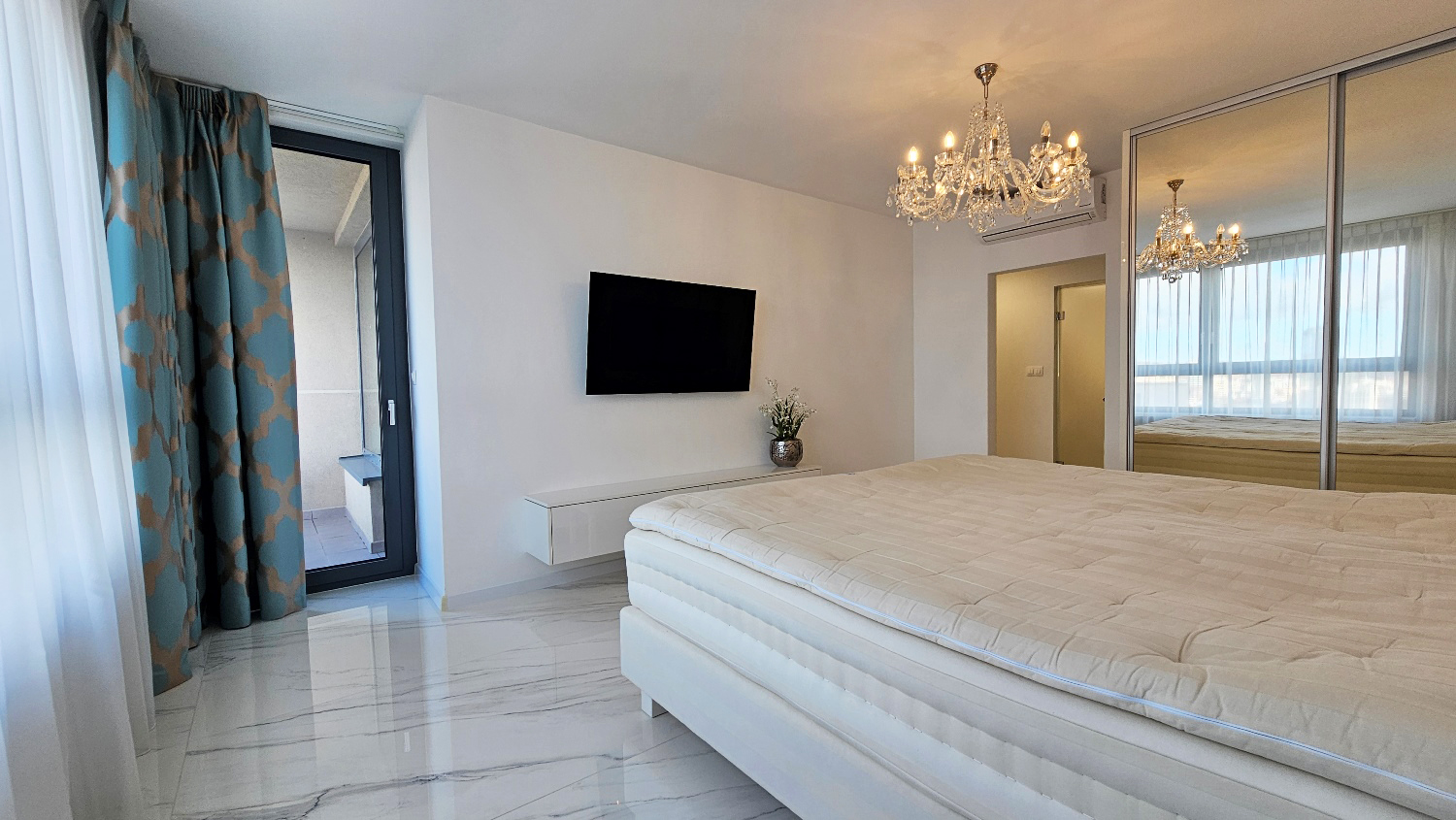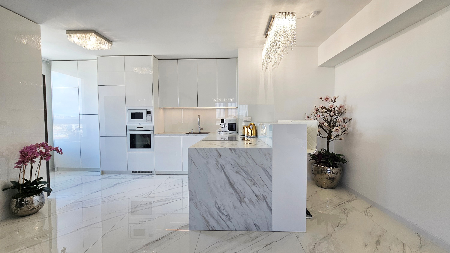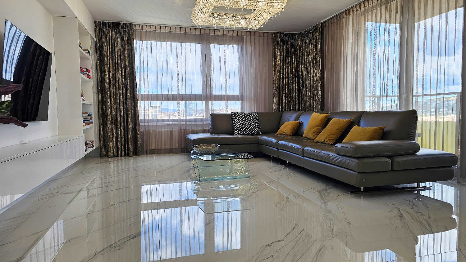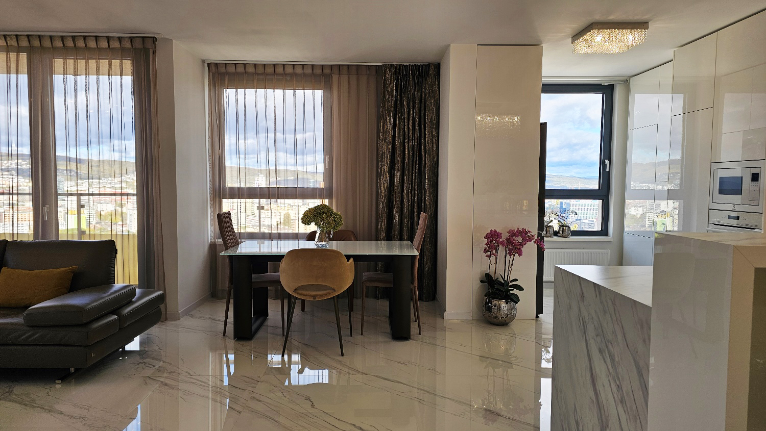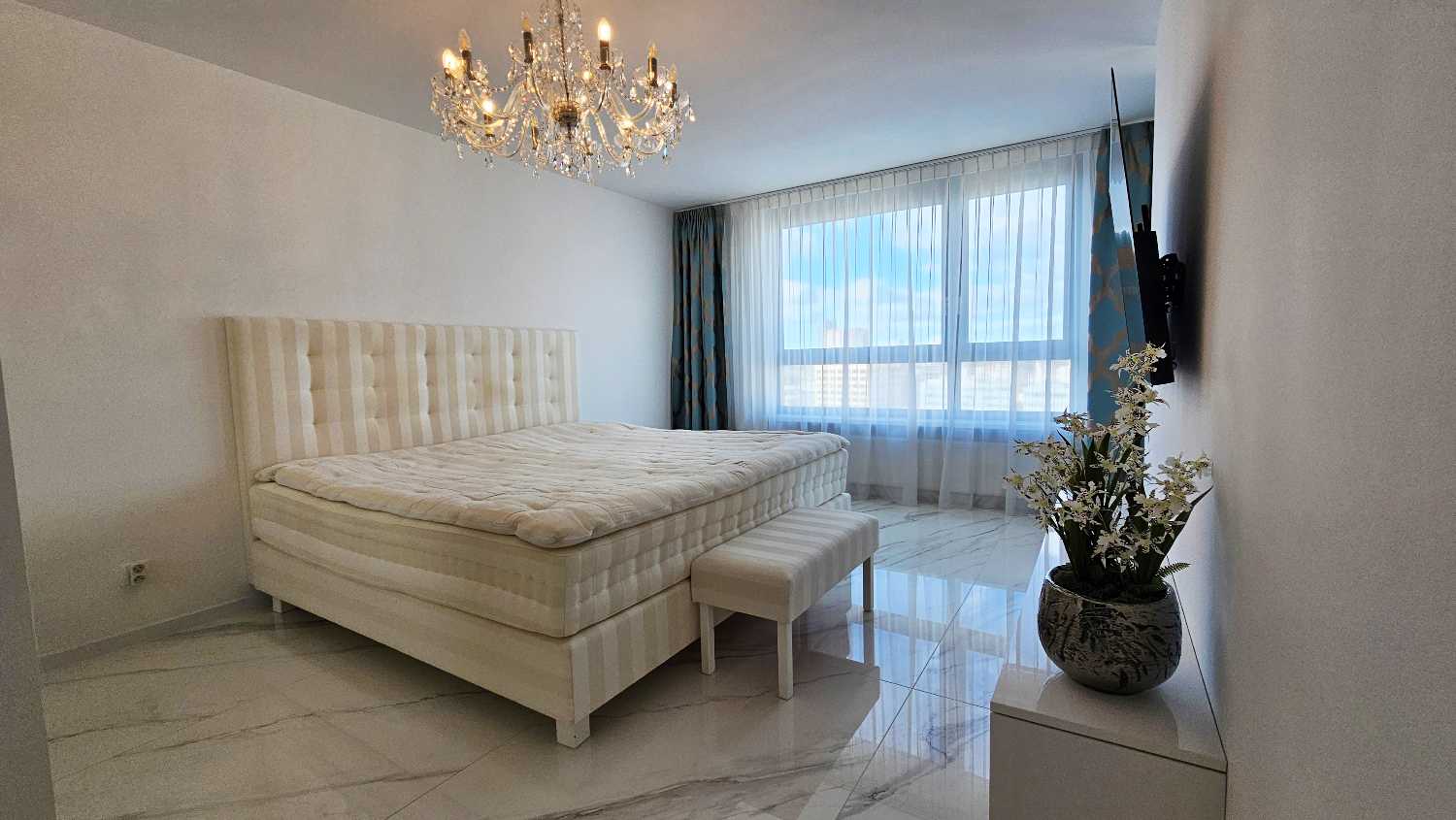 Novostavba z roku 2018. Španielska veľkoformátová dlažba v celom byte, krištáľové lustre s reguláciou, kožená sedacia súprava. Kompletne vybavená kuchynská linka so spotrebičmi Electrolux (mikrovlnná rúra, rúra na pečenie, umývačka riadu, sklokeramická varná doska s odsávačom zabudovaným do pracovnej dosky), americká 4-dverová chladnička. Hliníkové okná s trojitým zasklením a vetraním, motorizované žalúzie ovládané na diaľku. Radiátorové vykurovanie s individuálnou reguláciou, elektrické podlahové kúrenie v kúpeľni, klimatizácia v každej izbe.