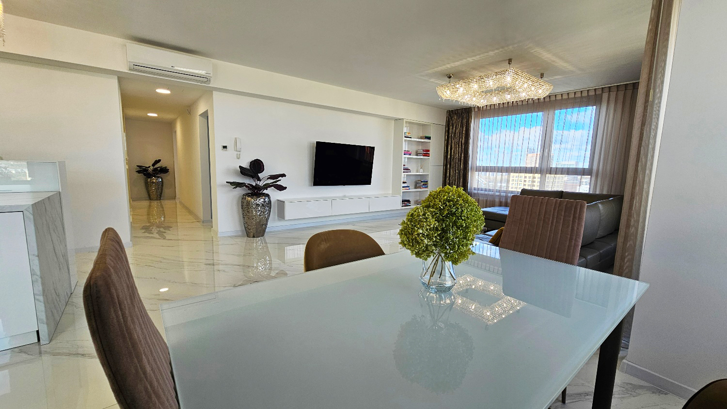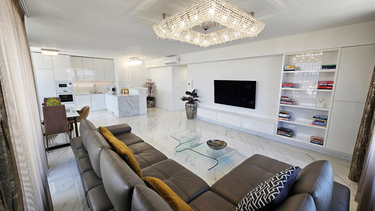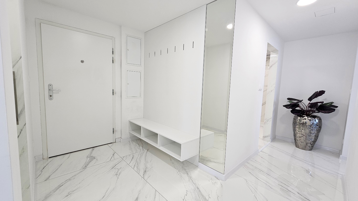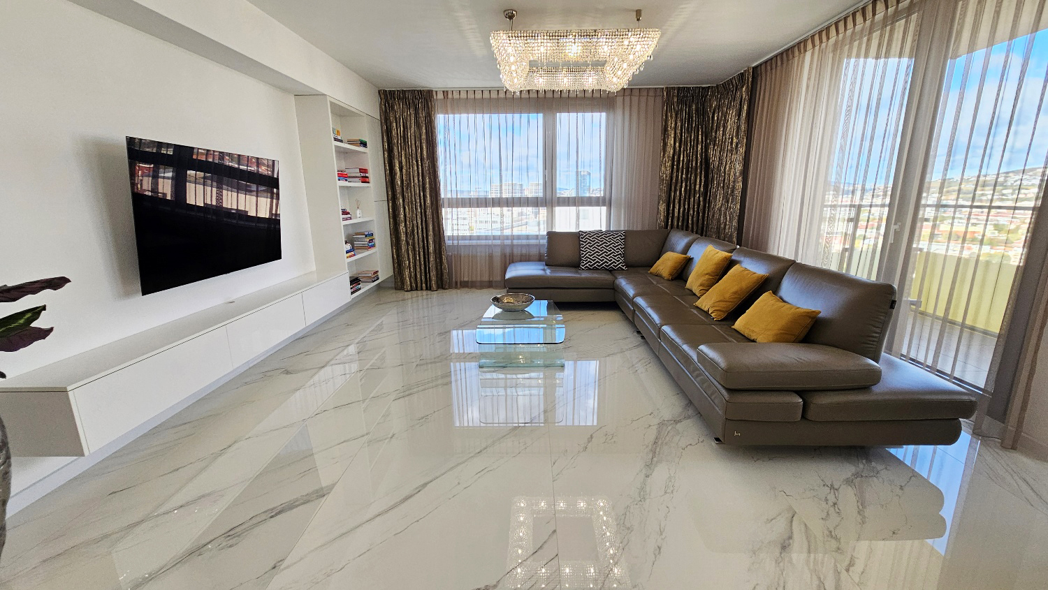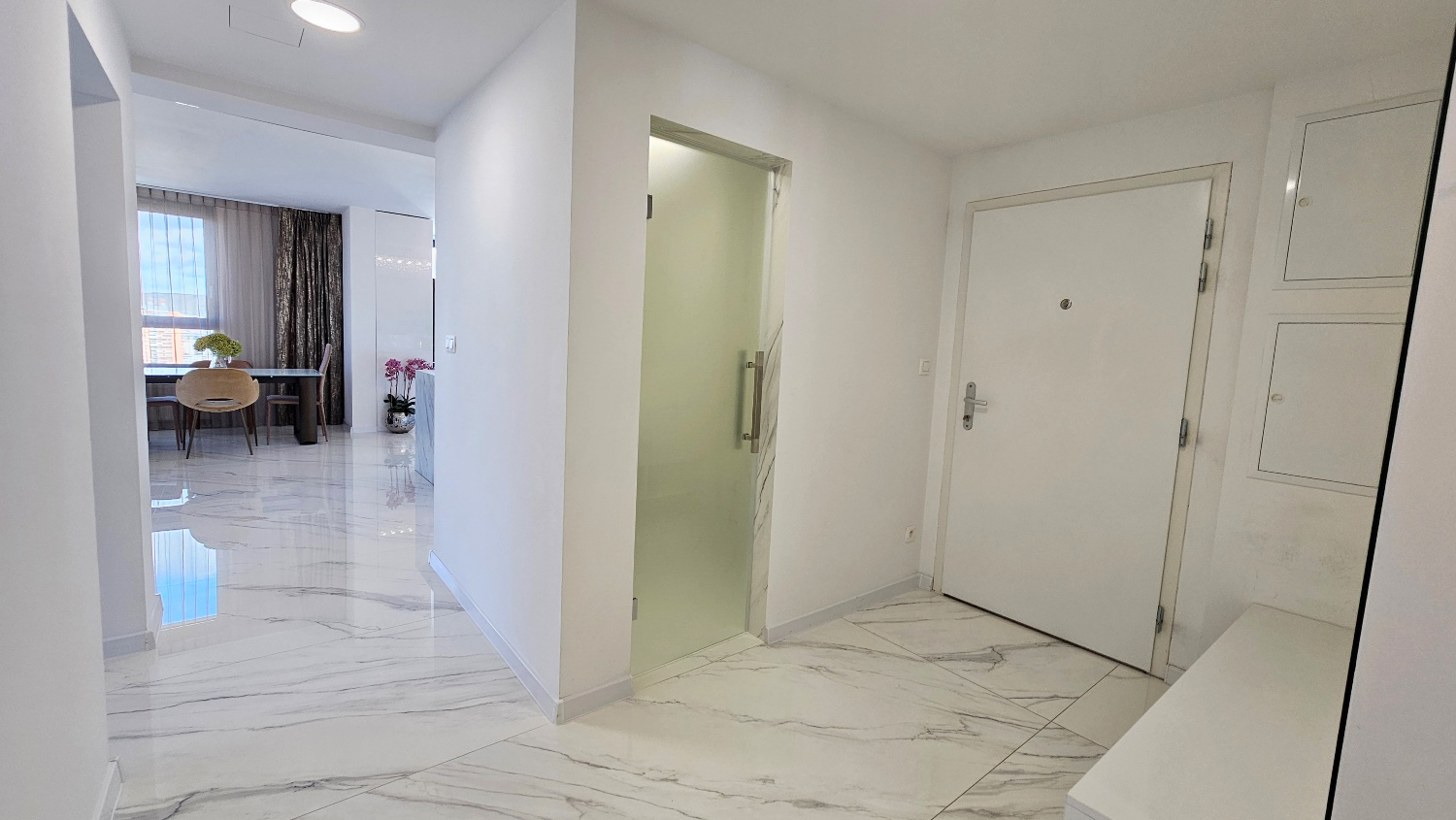 Novostavba z roku 2018. Španielska veľkoformátová dlažba v celom byte, krištáľové lustre s reguláciou, kožená sedacia súprava. Kompletne vybavená kuchynská linka so spotrebičmi Electrolux (mikrovlnná rúra, rúra na pečenie, umývačka riadu, sklokeramická varná doska s odsávačom zabudovaným do pracovnej dosky), americká 4-dverová chladnička. Hliníkové okná s trojitým zasklením a vetraním, motorizované žalúzie ovládané na diaľku. Radiátorové vykurovanie s individuálnou reguláciou, elektrické podlahové kúrenie v kúpeľni, klimatizácia v každej izbe.