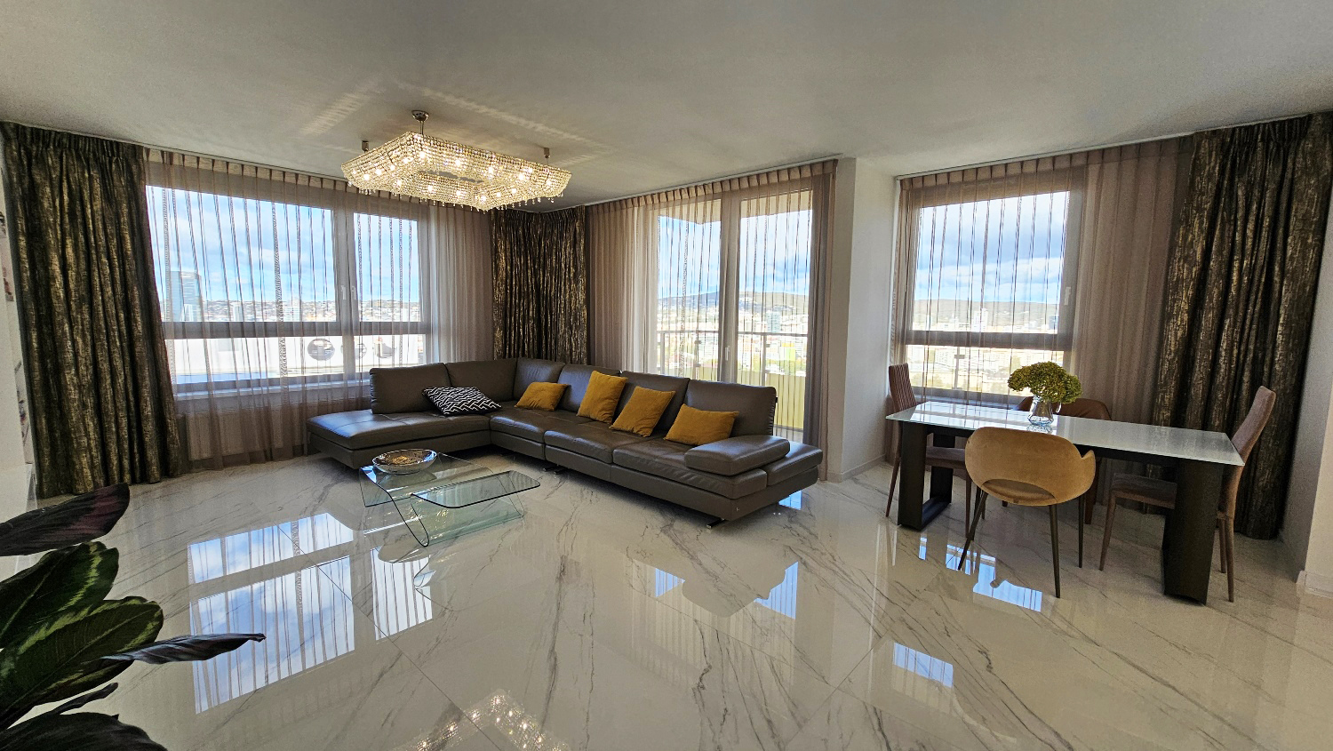 117,79 m² luxusného priestoru na jednom z najvyšších poschodí projektu CityPark. Dizajnovo zariadený byt s 5,04 m² loggiou, 4,14 m² balkónom a 5,78 m² pivnicou. Kľúčom otočíte a bývate: kompletná kuchynská linka s technikou, nadčasový nábytok, prvotriedne materiály, všetko ostáva. Panoramatické výhľady na mesto, rána s kávou v rukách a Bratislavou pod vami.