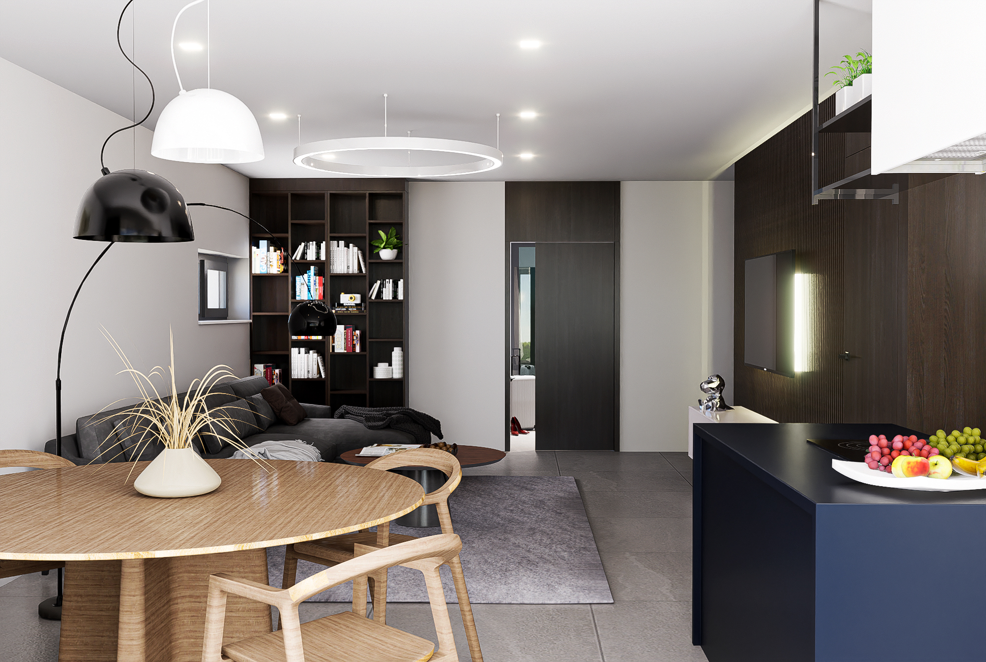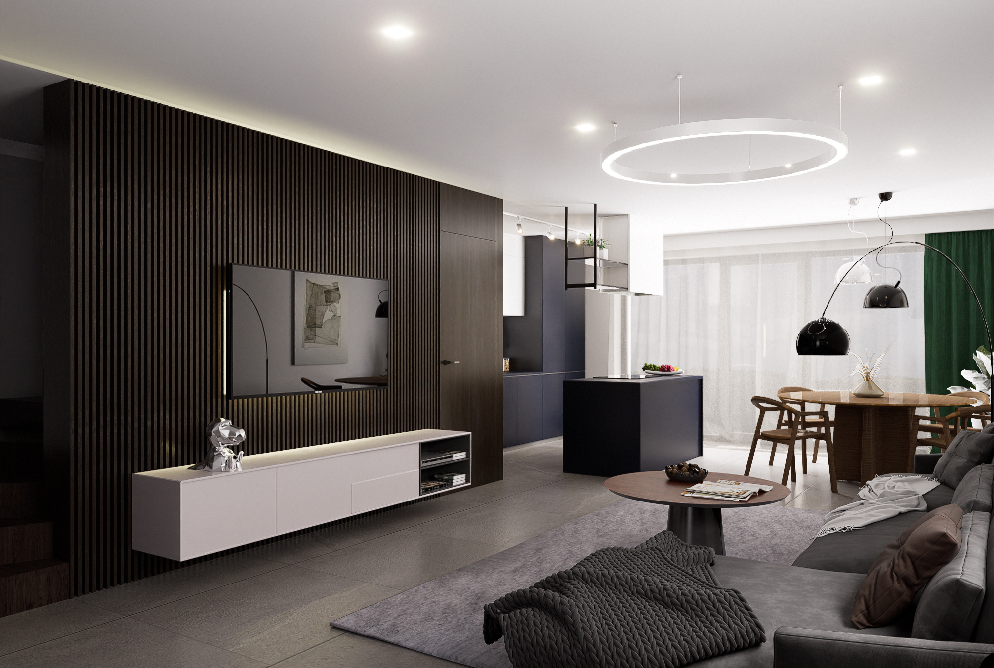 Interiér domu je navrhnutý v modernom a elegantnom štýle s praktickým rozdelením dennej a nočnej časti a dostatkom úložného priestoru.