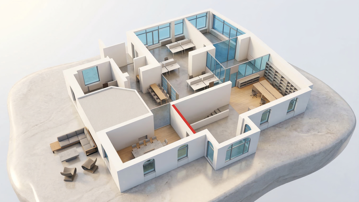 Historická budova, svieži interiér. Veľké pôsobivé okná, flexibilné priečky, priestranné terasy. Súčasťou priestorov sú kuchynská linka a sociálne zariadenia.