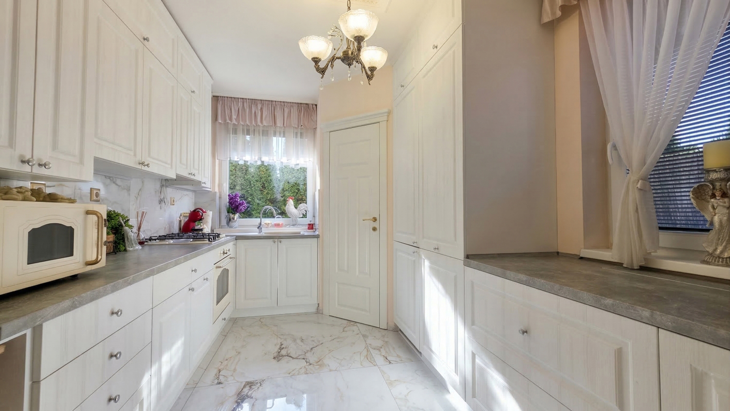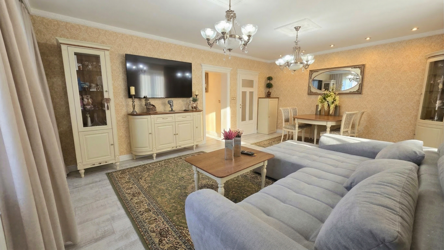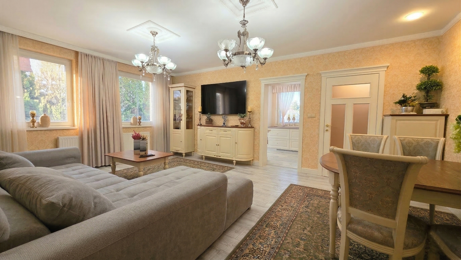 Lebo tento bungalov má štýl, súkromie a 100,57 m² komfortu bez schodov, s interiérom, ktorý si zapamätáte: textilné tapety, nábytok s charakterom, 16 m² zimná záhrada so sklenenými stenami, ktoré sa plne otvárajú = terasa aj extra izba v jednom. Všetko na rovinatom pozemku 504 m² s garážou 46 m² v pokojnej lokalite kúpeľného mesta.