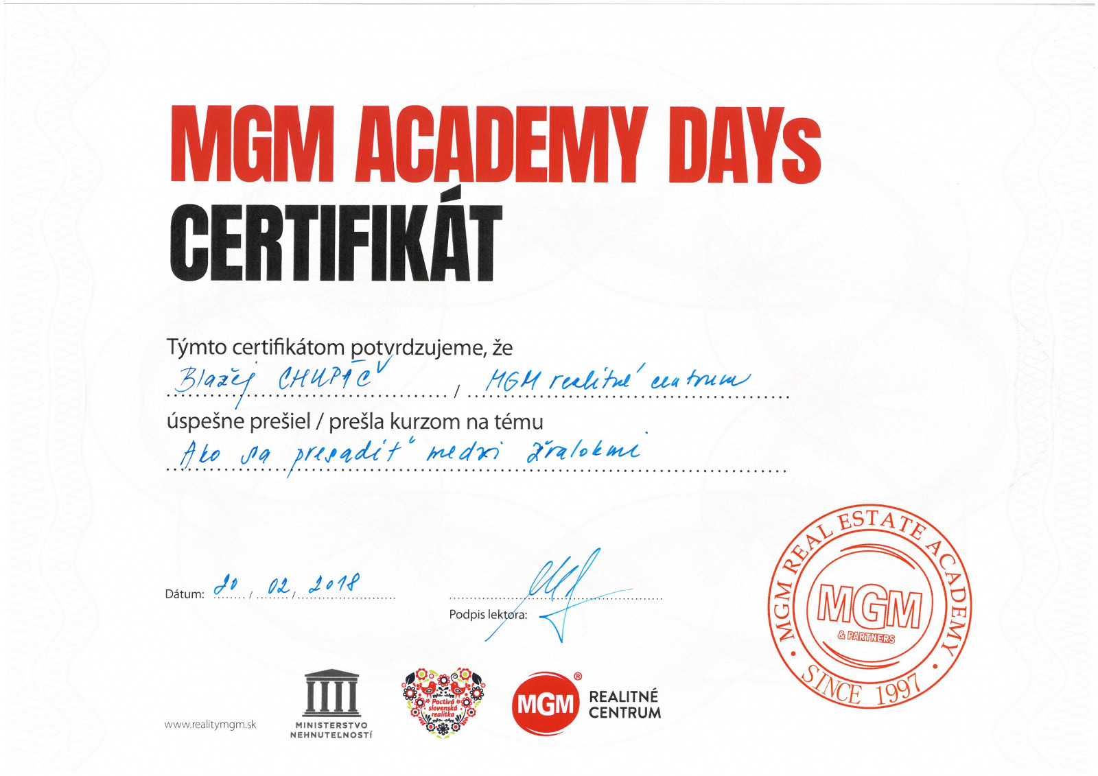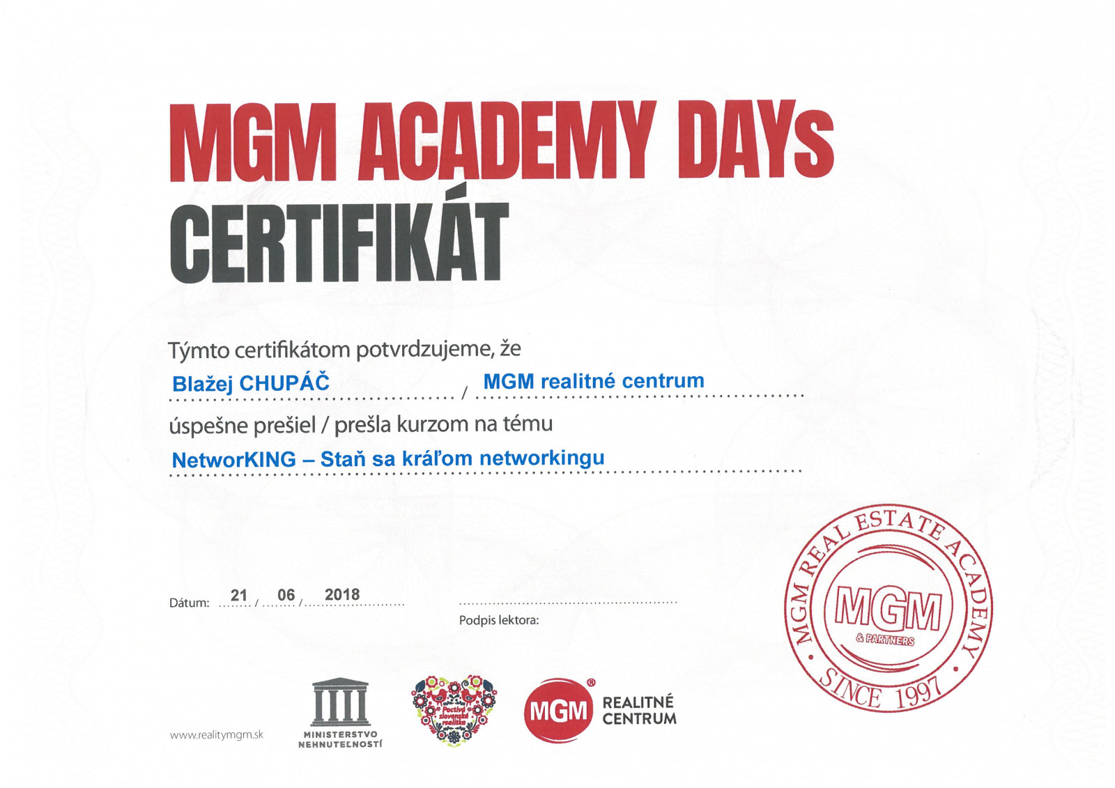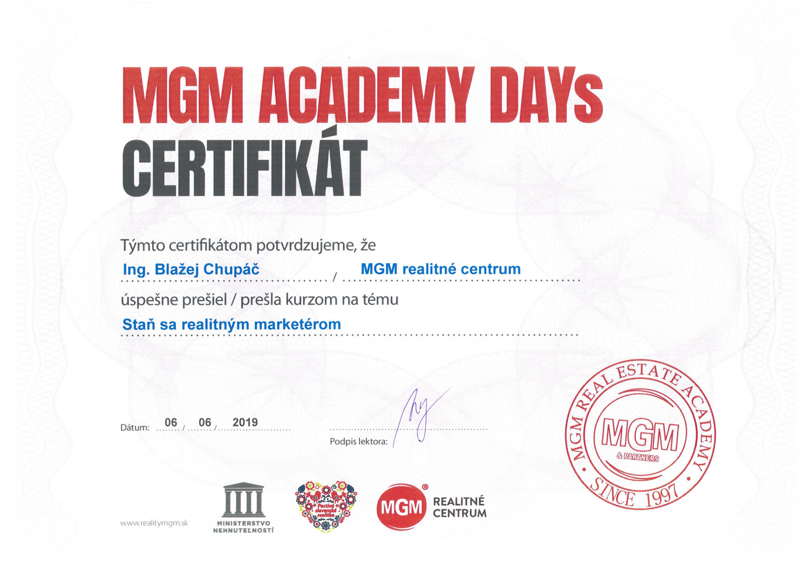 Blažej sa zaujíma o realitný trh dlhodobo. Je to preňho koníček, ktorý sa napokon rozhodol spojiť s prácou, a tak posilnil tím realitného centra MGM.  Pracovať v oblasti realít vníma ako poslanie naplniť požiadavky klientov a pomôcť im pri realizácii obchodu. Každý prípad berie veľmi osobne a dôvera klienta je preňho zaväzujúca. Najväčšou radosťou a taktiež prioritou číslo jeden pri každom dokončenom obchode je preňho spokojnosť klienta.