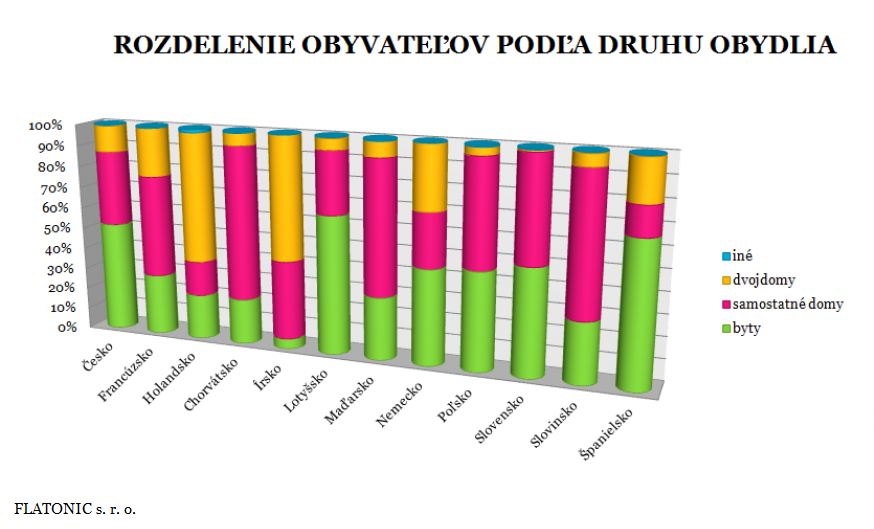 Zdá sa, že Slováci bývajú buď v bytoch alebo v domoch. Ťažko povedať, čo z toho sa nám javí ako atraktívnejšie - snáď len s malým náskokom vedú tie byty (50,3 %). Tomu by sa dozaista čudovali všetci Íri či Chorváti. Na druhú stranu, určite by s nami sympatizovali Lotyši, u ktorých je podiel osôb žijúcich v bytoch spomedzi členských štátov EÚ jeden z najvyšších. Len 6% z nás našlo svoje bývanie v dvojdome, kým napríklad v Holandsku takto žije drvivá väčšina obyvateľstva (61,2 %). Páčilo by sa Vám bývanie v rodinnom dome? Pravdepodobne nikto ho nepreferuje viac ako Chorváti (72,6 %) a azda nikto ho nezatracuje viac ako Španieli.
