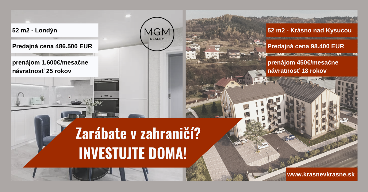 Pokračujeme v Anglicku, konkrétne v Londýne. Malý byt vo výmere 52 m2  viete kúpiť pod 500tis. EUR. Prenájom sa pohybuje na úrovni cca 1600 EUR/ mesiac, čo nám dáva 25 ročnú návratnosť kúpnej ceny.  Poďme na Slovensko, porovnali sme byt v Krásne Nad Kysucou, mestom medzi Žilinou a Čadcou s novým priemyselným parkom, kompletnou občianskou vybavenosťou a obrovským dopytom po nájomnných bytoch.  V projekte www.krasnevkrasne.sk 52m2 2 izb. byt stojí 98.400 EUR ( dá sa kúpiť za ½ cenu oproti rovnakému bytu v Žiline). Takýto byt prenajmete za 450 EUR/ mesačne. Návratnosť je 18 rokov. Inými slovami, kúpnu cenu bytu v Krásne máte splatenú o 7 rokov skôr, ako v Londýne. Pokiaľ máte záujem o bezplatnú konzultáciu, kontaktujte nás telefonicky na tel:00421910861186 alebo e-mailom na reality@realitymgm.sk