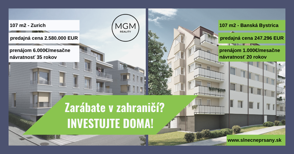 Začíname vo Švajčiarsku, v Zurichu, kde za 107 m2 byt zaplatíte takmer 2,6 mil. EUR.  Dokážete ho prenajať za cca 6.000 EUR/ mesiac. Návratnosť nám vychádza 35 rokov. Toto sme porovnali s rovnako veľkým bytom v Banskej Bystrici v projekte www.slnecneprsany.sk, kde rovnako veľký byt je takmer 10x lacnejší, dá sa kúpiť  „len“za 247.296 EUR. Prenajmete ho síce „len“ za 1.000 EUR/ mesiac, no napriek tomu je jeho návratnosť „len“ cca 20 rokov. Čiže oproti Zurichu, okrem desaťnásobne nižšej sumy sa vám investícia vráti o 15 rokov skôr.  Pokiaľ máte záujem o bezplatnú konzultáciu, kontaktujte nás telefonicky na tel:00421910861186 alebo e-mailom na reality@realitymgm.sk
